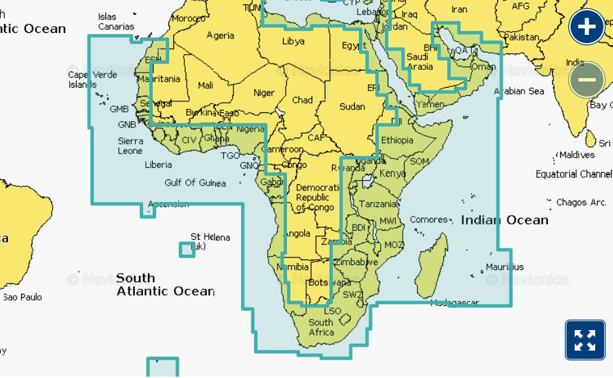 Coastal coverage of the coast of Africa from Tripoli, Libya thru the Red Sea and around the Cape to Dakar, Senegal including the Suez Canal and the Levant, the coast of the Arabian Peninsula, the Persian Gulf, Madagascar, Socotra, Zanzibar, Reunion, Mauritius, the Seychelles, the Comoros, the Prince Edward Islands, Tristan de Cunha, St Helena Island, Ascension Island, the Cape Verde Islands, Malta and Cyprus. Coverage of ports such as Alexandria, Egypt; Djibouti; Manama, Bahrain; Dubai; Cape Town, South Africa and Lagos, Nigeria are included.