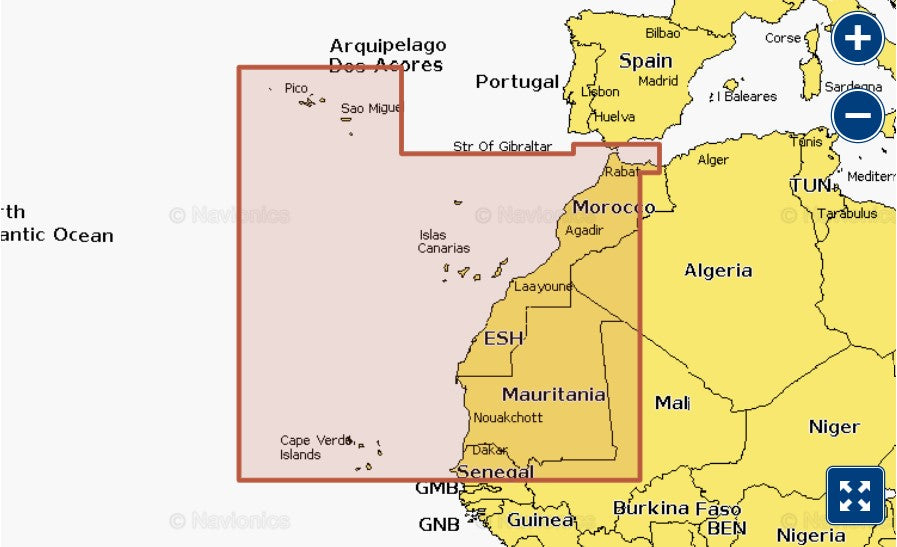 Coastal coverage of the northwest coast of Africa from St Louis, Senegal to Rabat, Morocco. Detailed coverage of the Azores, Madeira, the Canary Islands, the Cape Verde Islands and the ports of Rabat and Casablanca, Morocco are included.