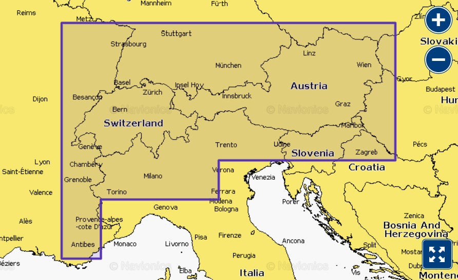Covers the lakes and rivers of the Alpine region of Europe. Coastal coverage includes Lakes Constance (Upper, Lower and Seerhein), Zurich, Lucerne, Geneva, Thun, Brienz, Annecy, Bourget, d'Aiguebelette, Lake of Sainte-Croix, Neuchatel, Maggiore, Orta, Como, Iseo, Lugano, Garda, Biel and Neusiedl/Ferto. Rivers include the Rhine from its headwaters to Germersheim, the Danube from its headwaters to Bratislava, the Necklar from its headwaters to Offenau and the Main-Danube Canal from Hilpoltein to the Danube. Other rivers include the Isar, the Inn, the Salzach and the Lech in their entireties.