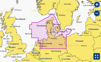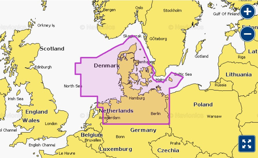 Detailed coverage of the North Sea and Baltic Sea coasts of Germany and Denmark. Coverage includes the Kiel Canal, the Szczecin Lagoon, the River Elbe, the Kattegat, Bornholm Island and the ports of Hamburg, Germany and Copenhagen, Denmark.