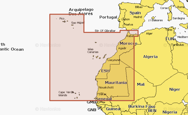 Coastal coverage of the northwest coast of Africa from St Louis, Senegal to Rabat, Morocco. Detailed coverage of the Azores, Madeira, the Canary Islands, the Cape Verde Islands and the ports of Rabat and Casablanca, Morocco are included.